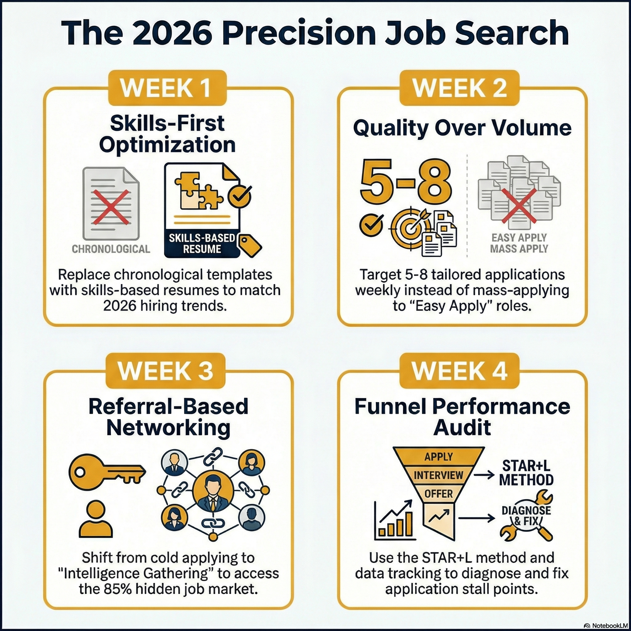 The plan prioritizes application quality, focusing on targeted roles, tailored materials, and clear follow-up strategies rather than mass applying.