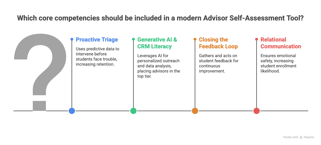 An effective tool must evaluate communication, triage, feedback, and tech familiarity. While standard tools focus on "knowledge of policy," modern frameworks emphasize "Relational" and "Technological" skills. You should assess your ability to move beyond transactional course scheduling and into proactive, data-informed student coaching that directly impacts retention and career readiness.