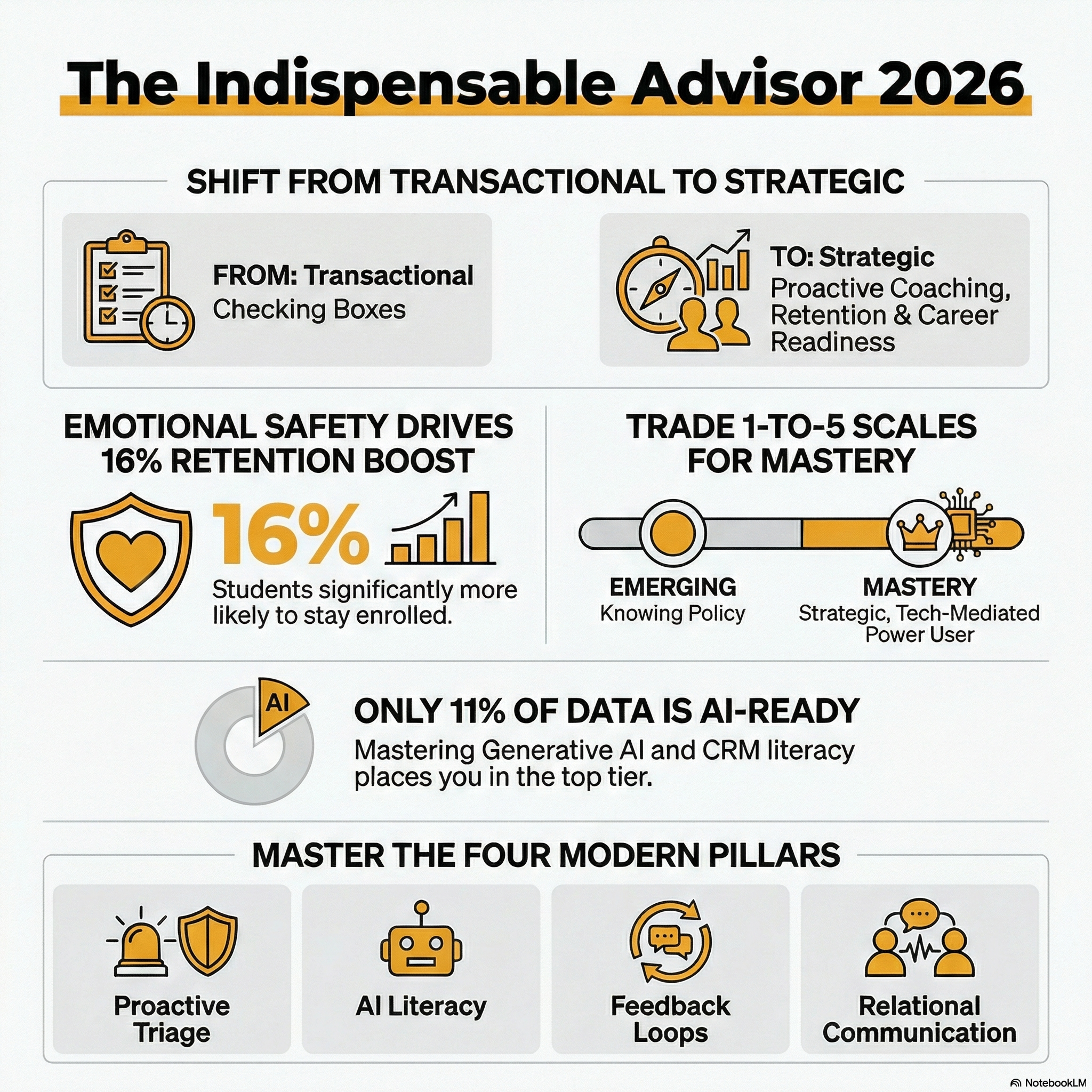 - Closing the Feedback Loop: You must assess how you gather and act on student feedback. High-performing advisors at the University of South Florida use "Condition-based" assessments to move beyond simple "student satisfaction" surveys.