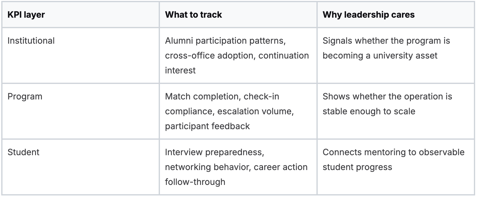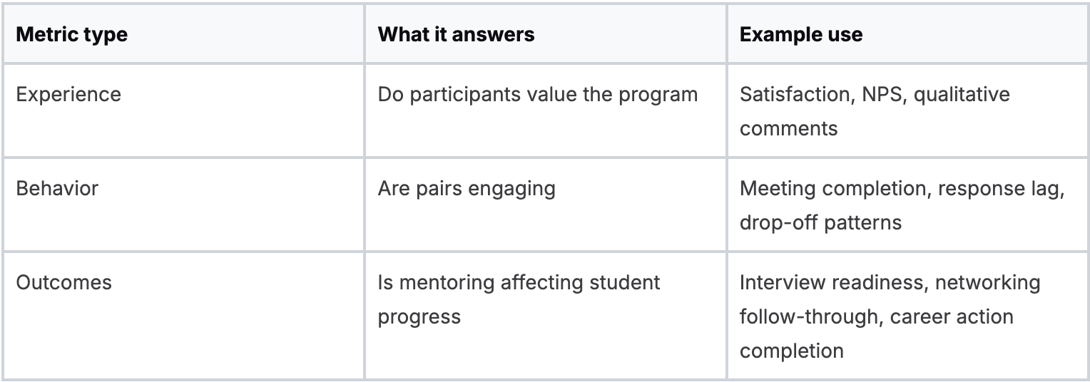 Career centers building that reporting layer often start with a framework like this one on career center metrics, then adapt it to mentoring-specific use cases.
