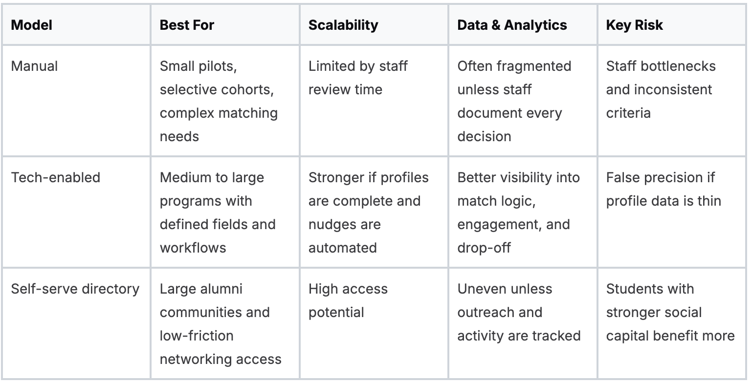 The right matching model depends on staff capacity, data quality, and the level of control your institution needs. Manual matching can produce strong pairings. It also creates bottlenecks. Self-serve directories expand access. They can widen equity gaps. Tech-enabled matching sits in the middle, but only if the underlying data is usable.