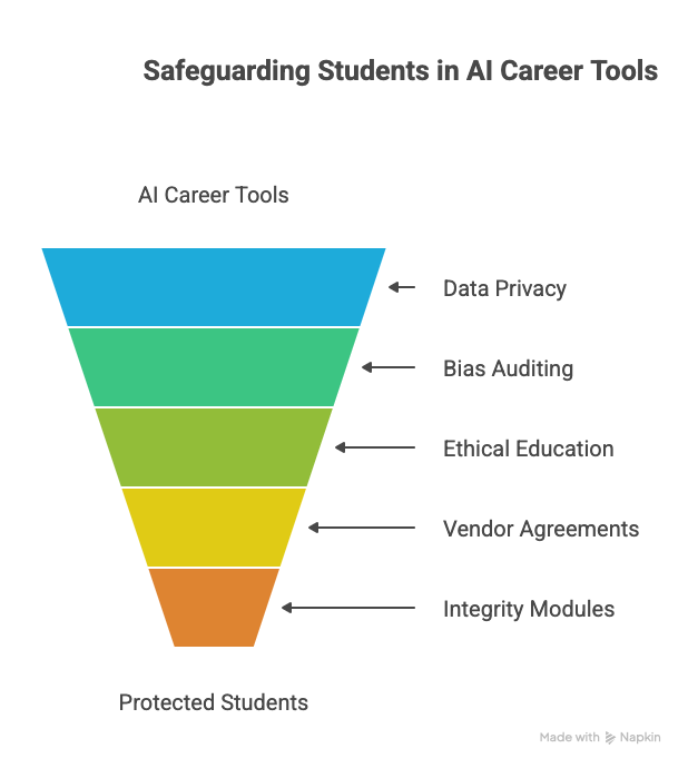 Effective safeguards prevent demographic bias, protect personal data, and ensure academic integrity. You must implement strict data privacy rules, audit AI models for biased career routing, and aggressively educate your students on the ethical boundaries of generative AI to prevent misrepresentation and outright plagiarism.