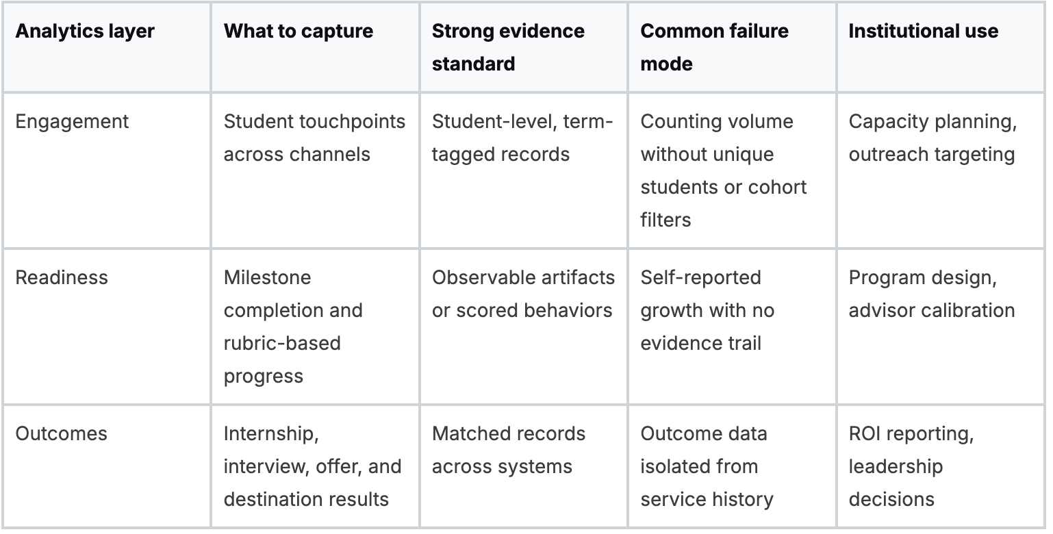 Foundational analytics track who engages, what changes for the student, and whether that change connects to an outcome. Attendance alone is weak. A mature baseline links service usage to observable readiness evidence and then to downstream results such as internship conversion, interview progression, or first-destination outcomes.