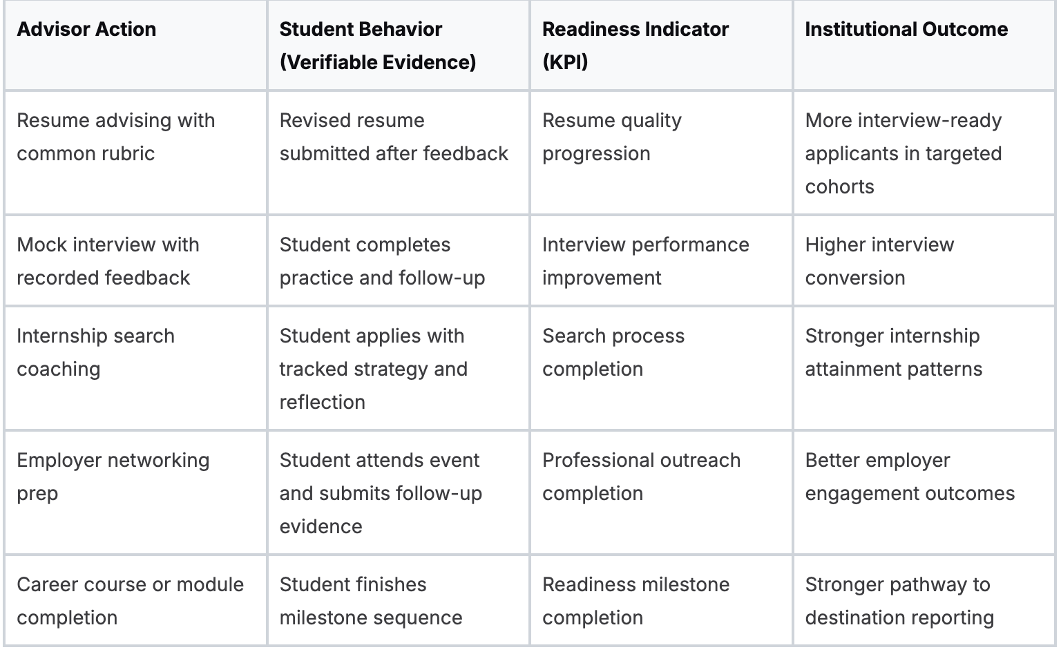 - Readiness analytics capture evidence that a student changed something. Resume revisions, mock interview performance, completed career milestones, and documented advisor follow-through belong here.