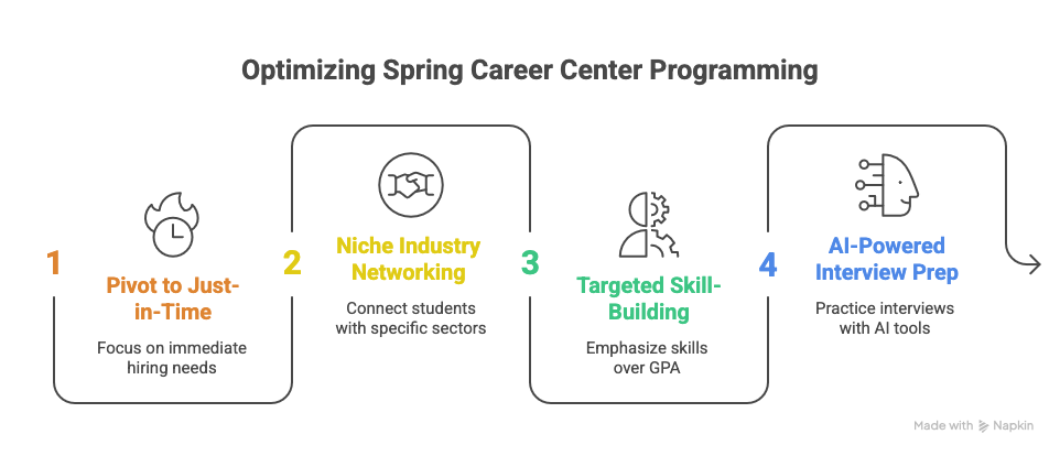 Spring programming should pivot entirely to just-in-time hiring, niche industry networking, and targeted skill-building workshops. Since the massive fall fairs are over, replace them with smaller, major-specific networking nights and interview prep bootcamps designed to catch the remaining students who have not secured their post-graduation employment plans yet.