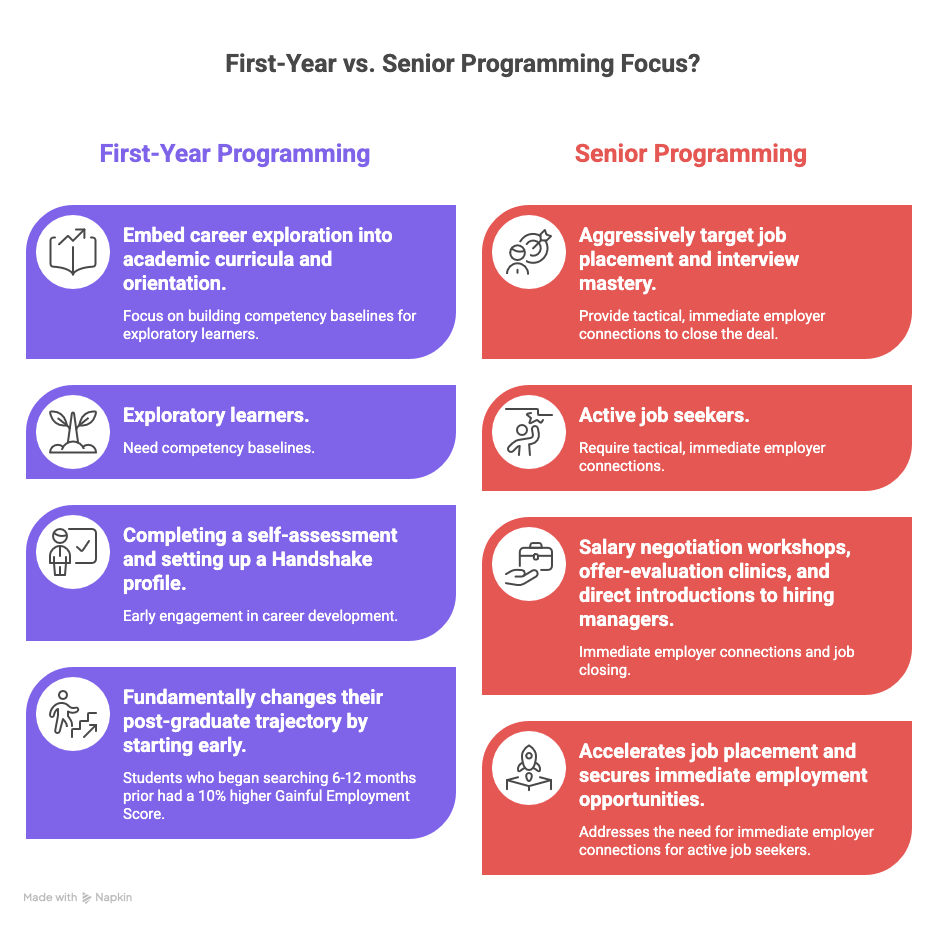 First-year programming must embed career exploration into academic curricula and orientation, while senior programming must aggressively target job placement and interview mastery. Treat first-years as exploratory learners who need competency baselines, and treat seniors as active job seekers who require tactical, immediate employer connections to close the deal.