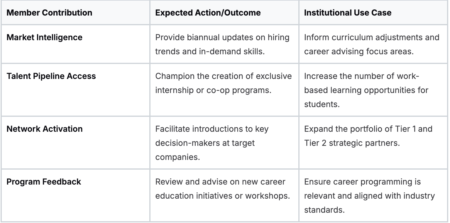 Advisory boards and alumni networks provide direct access to market intelligence, high-value opportunities, and warm introductions at target companies. A well-curated board of strategic partners and influential alumni offers real-time feedback on skills gaps and industry trends, enabling career centers to align programming with employer needs.