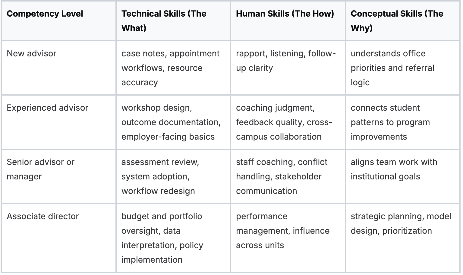 A centralized center may prioritize consistency, systems fluency, and shared employer protocols. A federated model needs more partnership management, influence, and contextual judgment inside colleges.