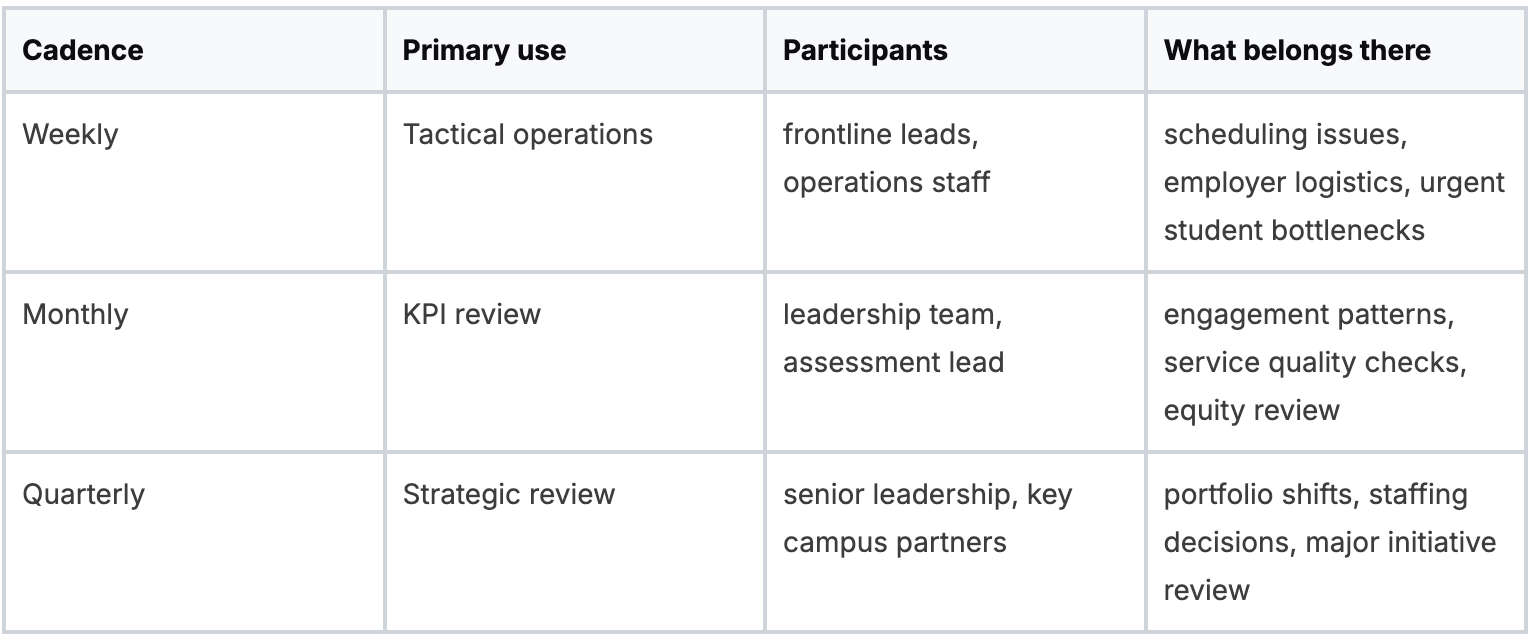 These are structured cadences, weekly, monthly, and quarterly, that define when data is reviewed, who interprets it, and what decisions are made based on it.
