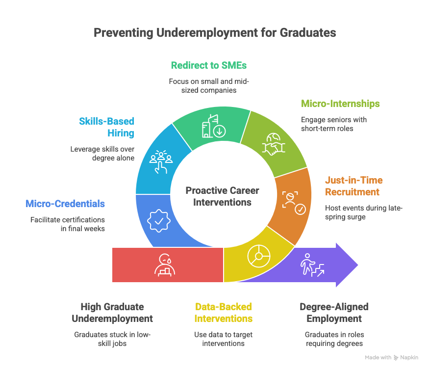 Career centers can support unplaced seniors by shifting from broad job-search guidance to late-cycle, data-backed interventions. This includes identifying underemployment risk early, redirecting students toward small and mid-sized employers, closing skill gaps with short-term credentials, and activating just-in-time hiring strategies such as alumni referrals, micro-internships, and targeted hiring events. When seniors receive fast, skills-aligned support during the final weeks before graduation, their chances of securing degree-relevant roles improve significantly.