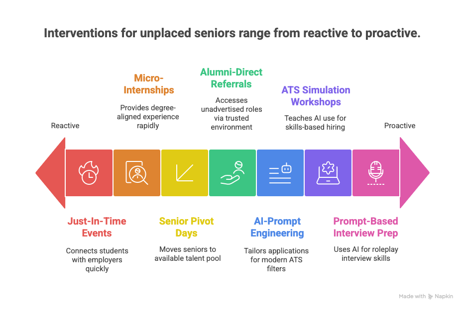 Just-in-time interventions include late-cycle career fairs, alumni referral events, and rapid hiring programs designed to connect seniors directly with employers who are actively hiring in April, May, and June.