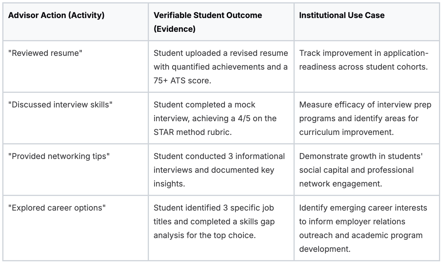 The goal isn’t just better documentation. It’s a system where every advising interaction contributes to measurable student progress, and a clearer picture of career center impact.