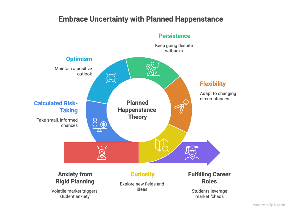 Planned Happenstance Theory (PHT) encourages students to embrace unplanned events as opportunities rather than threats. Instead of focusing on a rigid 5-year plan which triggers anxiety when life changes, CSPs teach five key behavioral traits: curiosity, flexibility, persistence, optimism, and calculated risk-taking to leverage the "chaos" of the 2026 job market.