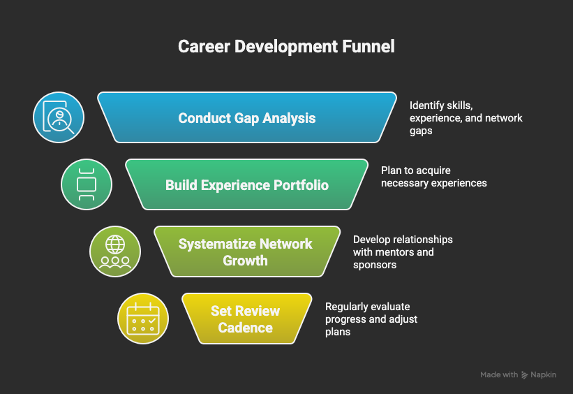 - Network Gaps: These are the people and insights you don't have access to. Examples: "My vision is in product marketing, but I don't know anyone in that department." "My entire network is at my current company." "I don't have a sponsor who will advocate for me in rooms I'm not in."