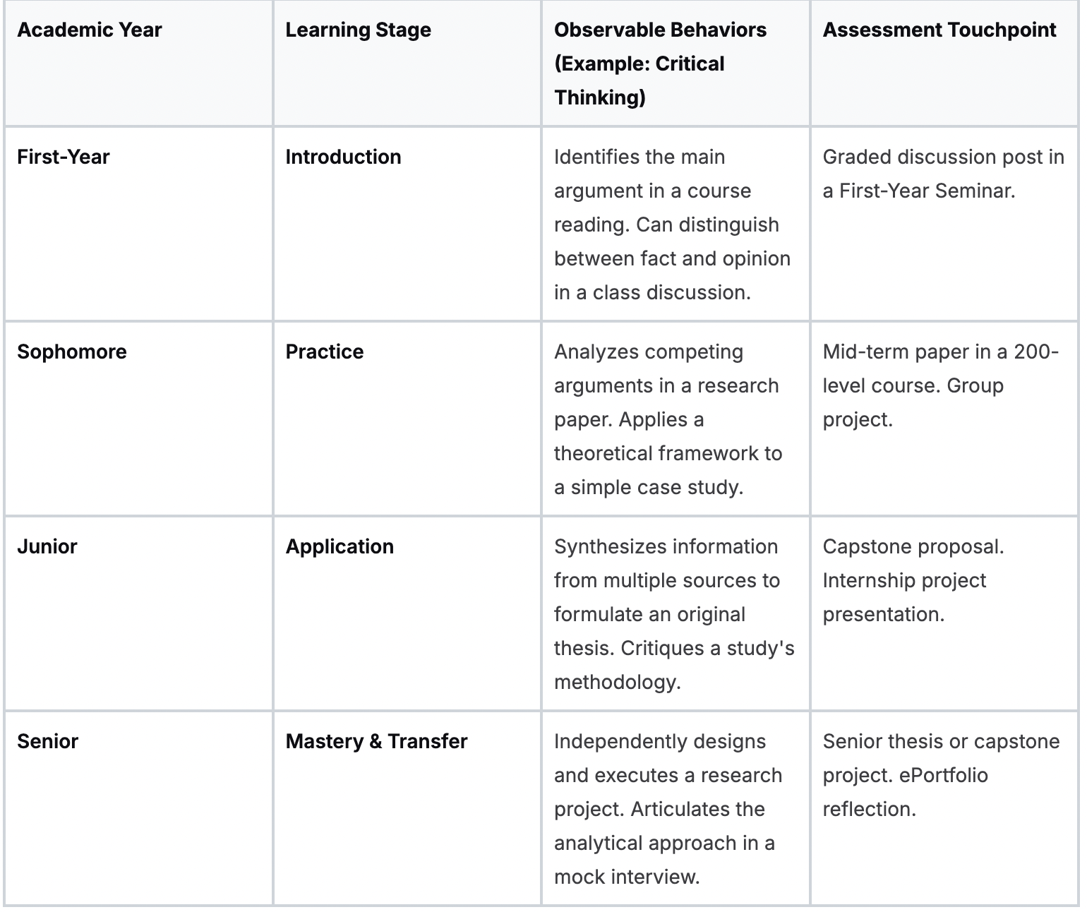For example, "Critical Thinking" for a first-year student might mean identifying an argument in a text, while for a senior it means independently designing and executing a research project.
