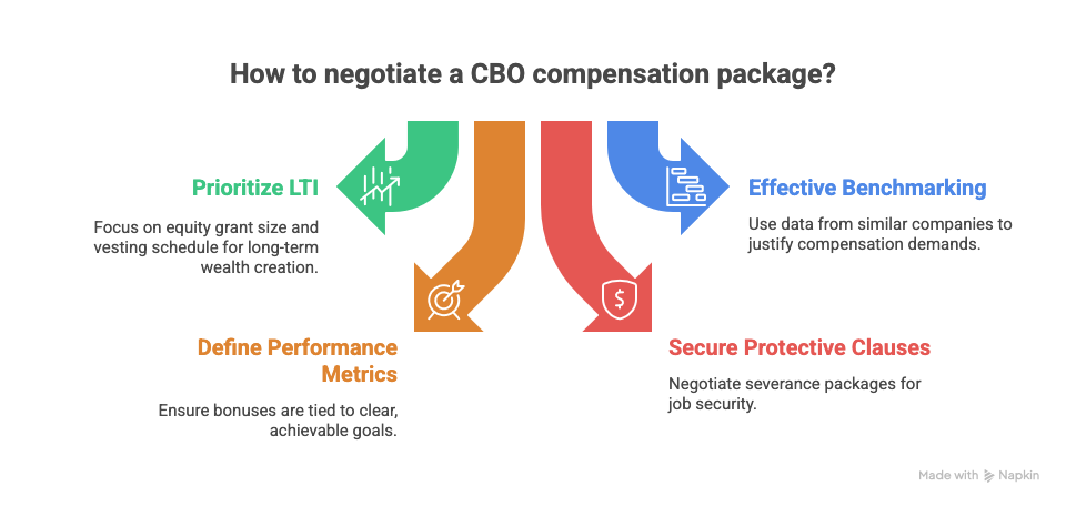 CBO candidates should focus their negotiation on the total value of the package, prioritizing Long-Term Incentives (LTI), benchmarking effectively, defining clear performance metrics for bonuses, and securing protective clauses like a severance package.