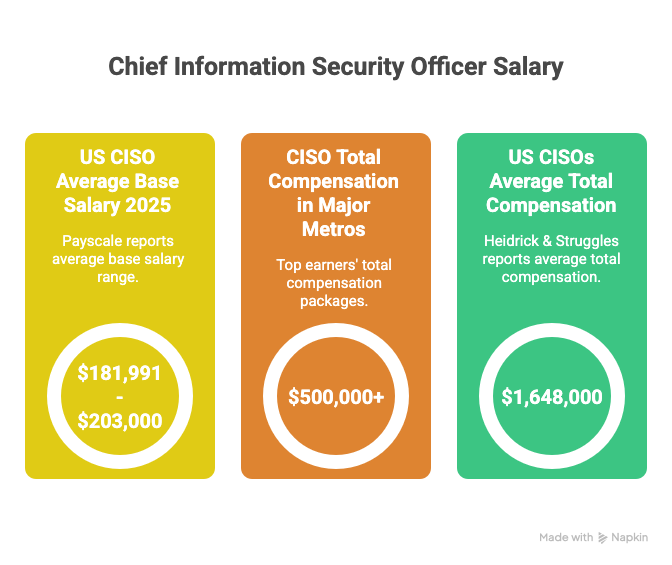 It varies by location and experience, but the financial rewards are significant. In the US, the average base salary for a CISO in 2025 falls between $181,991 and $203,000, with top earners in major metros commanding total compensation packages well over $500,000, according to Payscale.