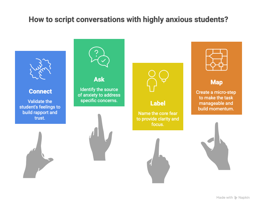 Advisors should use the CALM framework: Connect with their feeling, Ask about the source, Label the core fear, and Map a micro-step. This reframes anxiety from a barrier into a diagnostic tool. Rather than offering premature reassurance, this script validates the emotion and channels it into a single, manageable action, preventing cognitive overload and building momentum.