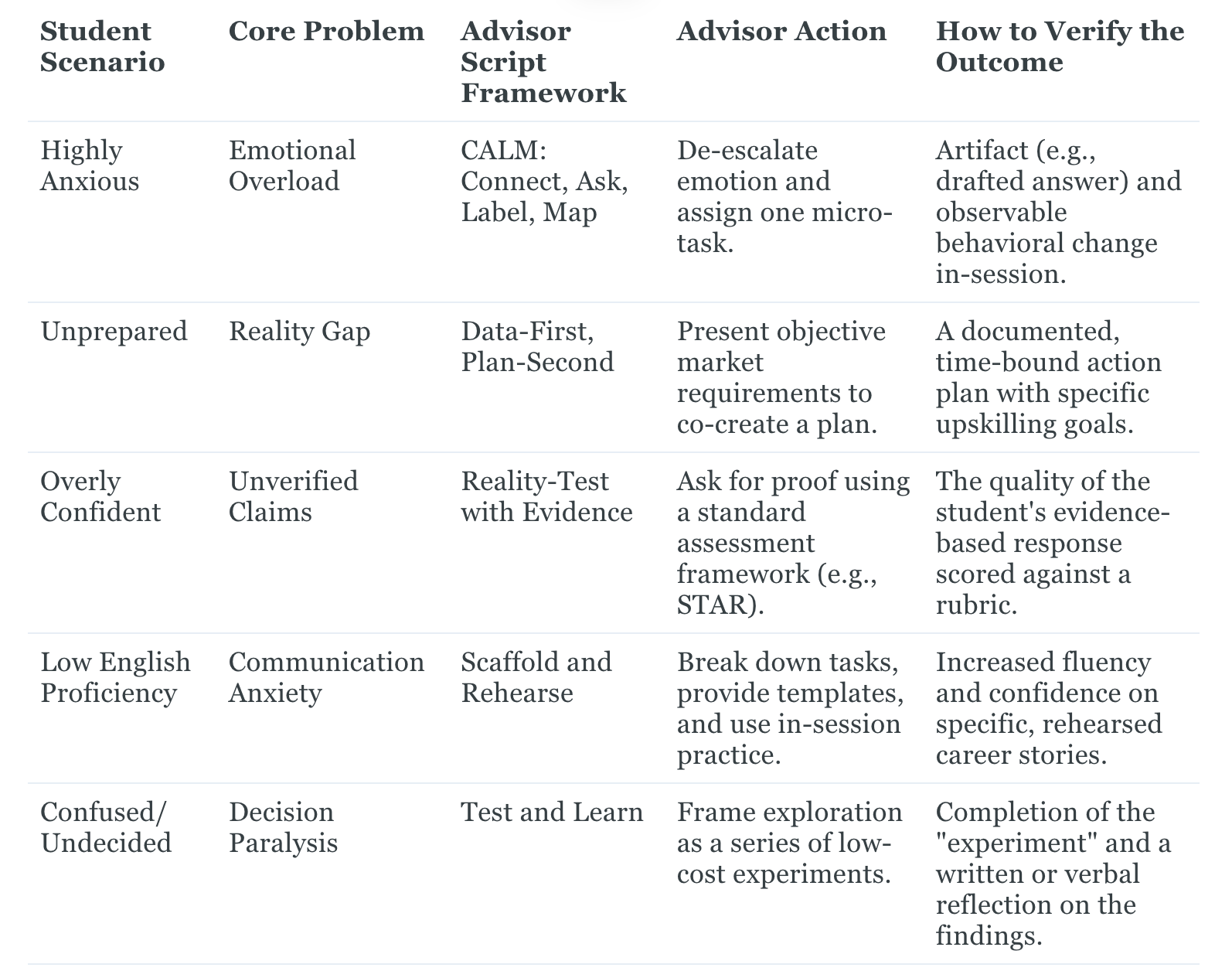 Verification: The outcome is verified by the student's completion of the agreed-upon experiment and the artifact of their reflection. The advising team at Wake Forest University uses a similar "prototyping" model, asking students to document their experimental outcomes and share what they learned in follow-up appointments, creating a portfolio of exploration.