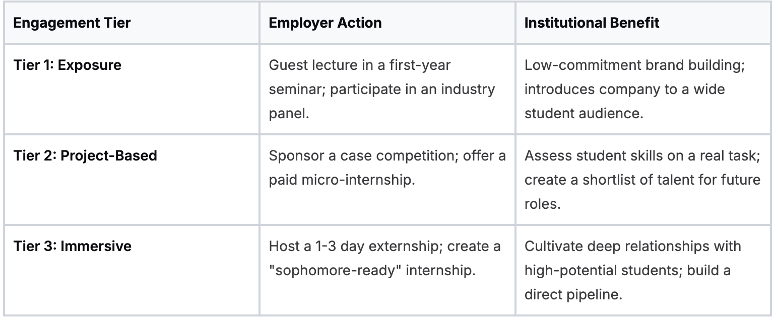 Instead of asking for a formal 10-week internship, propose a tiered partnership model that provides low-barrier entry points for employers.