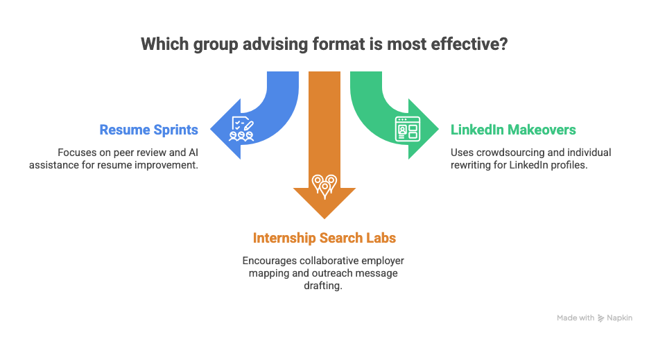 The most effective group advising formats are interactive, artifact-producing sprint workshops focusing on resumes, LinkedIn optimization, and internship searches. Instead of passively listening to a presentation, students actively build, critique, and refine their career documents in real-time alongside their peers and an advisor coach.