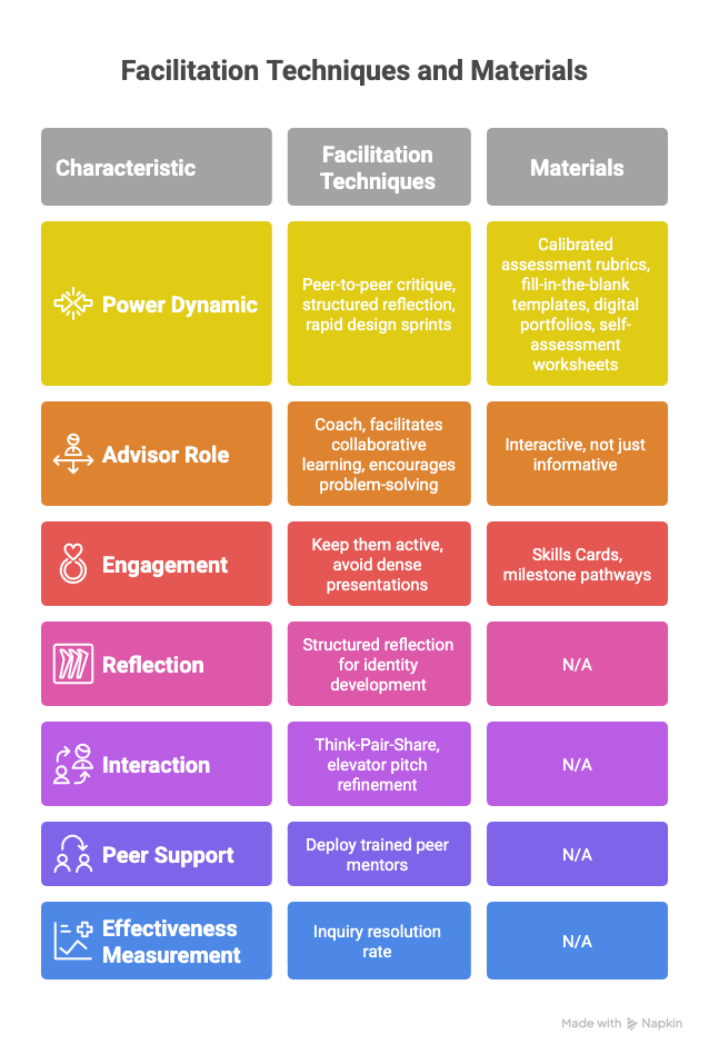 Effective facilitation flips the traditional power dynamic by using peer-to-peer critique, structured reflection, and rapid design sprints. Rather than talking at students, the career advisor acts as a coach who facilitates collaborative learning, encourages active problem-solving, and guides iterative feedback loops among the participants.