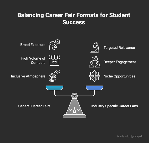 By offering a balanced portfolio of events and clearly communicating the purpose of each, career centers can leverage the best of both worlds, maximizing student engagement and success in their journey from campus to career.