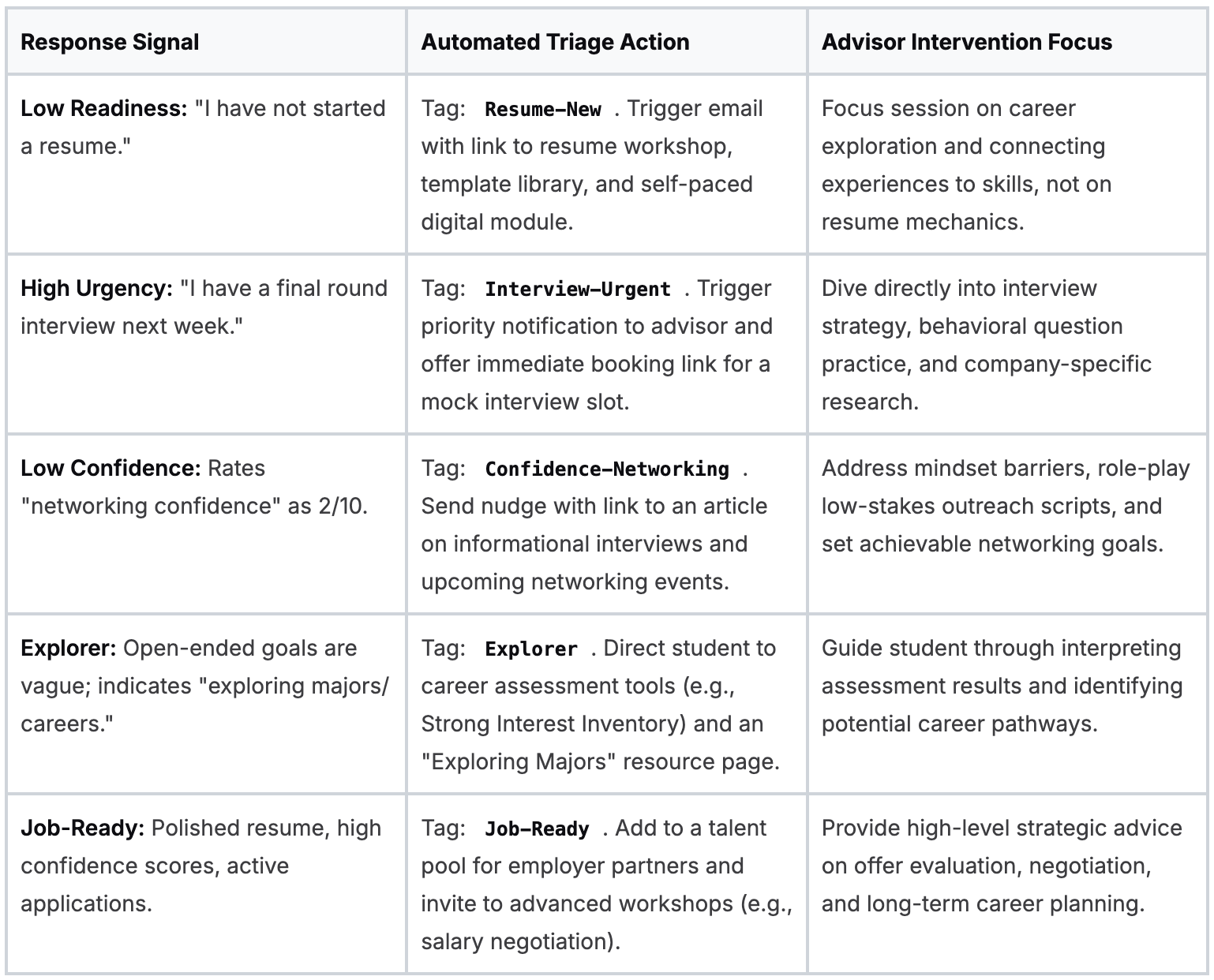 As career centers continue to evolve, the ability to combine structured intake, intelligent triage, and integrated tools will play a key role in delivering consistent, scalable outcomes for students.