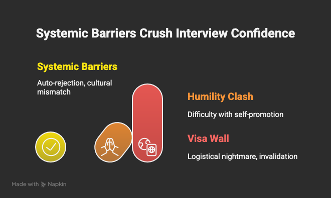Confidence isn't just about practicing. It's crushed by systemic barriers, particularly the "sponsorship check-box," which often auto-rejects them, and a deep cultural mismatch in communication styles.