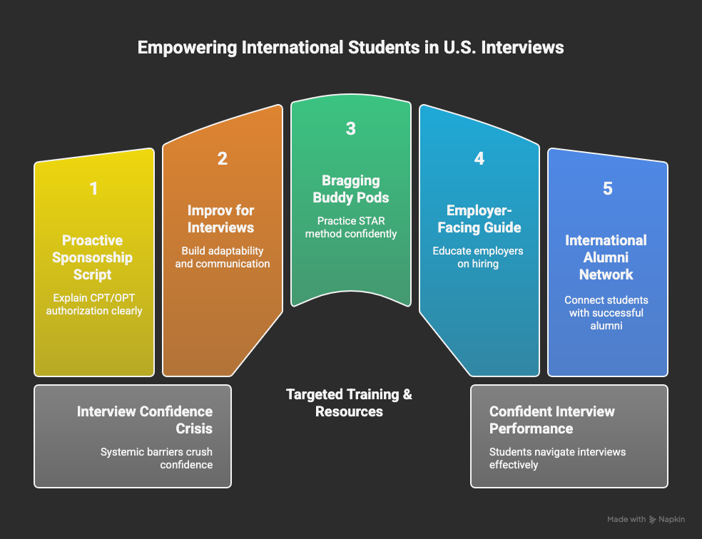 Technical preparation isn’t the main barrier—cultural communication gaps, sponsorship misconceptions, and unfamiliar interview dynamics are. Career centers can make the biggest impact by teaching a concise CPT/OPT script, running improv-style workshops to build conversational agility, creating peer “Bragging Buddy” pods for confident self-advocacy, appointing an International Student Specialist, publishing a clear employer-facing CPT/OPT guide, and connecting students with visa-friendly alumni and employers. These targeted interventions rebuild clarity, confidence, and outcomes.