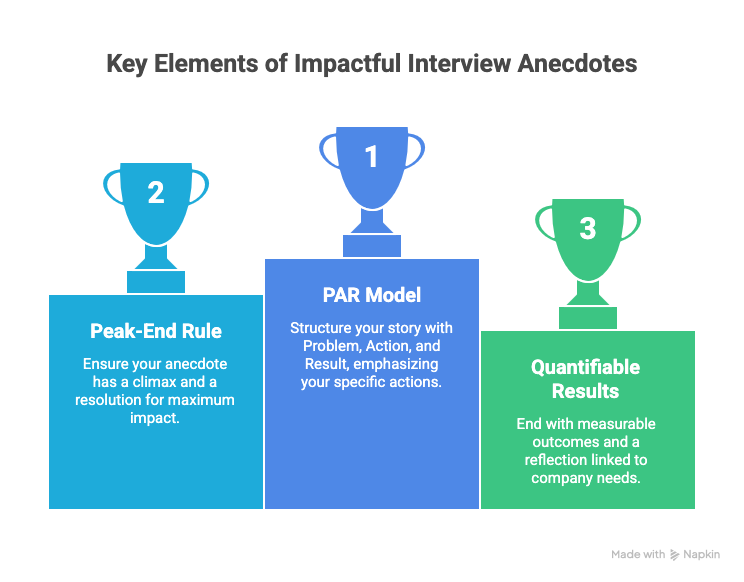 Interview anecdotes turn abstract skills into observable proof by showing how a candidate acted in a real situation, what decisions they made, and what outcomes followed, making their competence easier for interviewers to evaluate and remember.