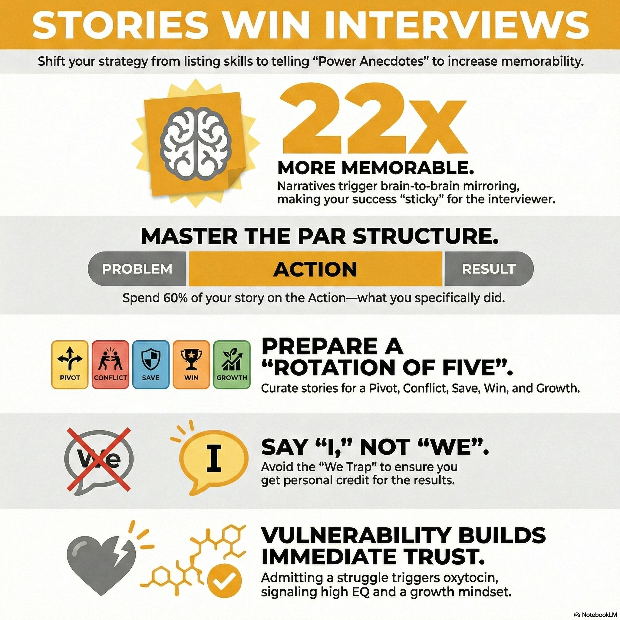 Anecdotes bridge the gap between "saying" and "proving." While data informs, stories stick. Humans are biologically wired to remember narratives over raw facts because stories trigger a physiological response in the brain, making you up to 22 times more memorable than candidates who only recite their job descriptions or statistics.