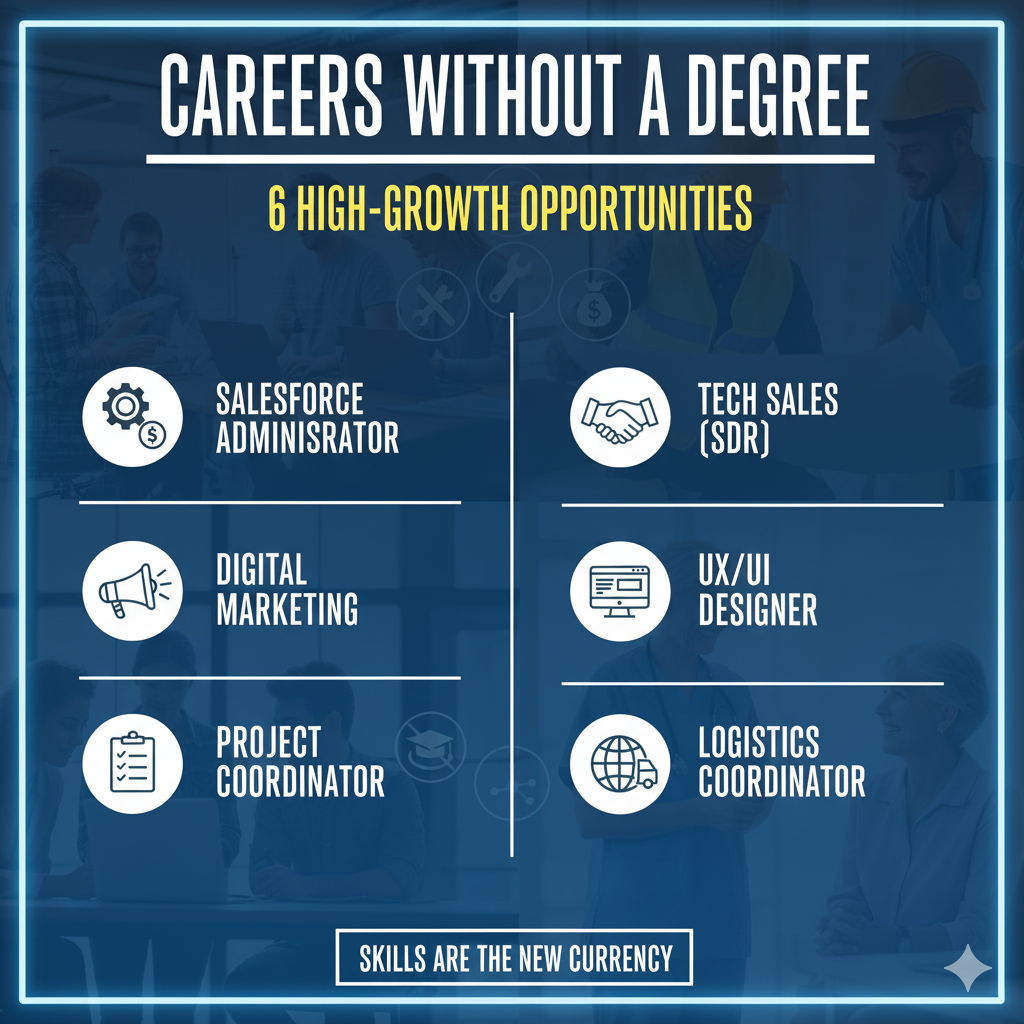 In today’s skills-first job market, you can launch lucrative careers without a traditional degree. Fields like Salesforce administration, digital marketing, project coordination, tech sales, UX/UI design, and nursing offer strong growth, high salaries, and accessible entry paths through certifications, portfolios, or licensing programs. What matters now is proving your skills—not your schooling.