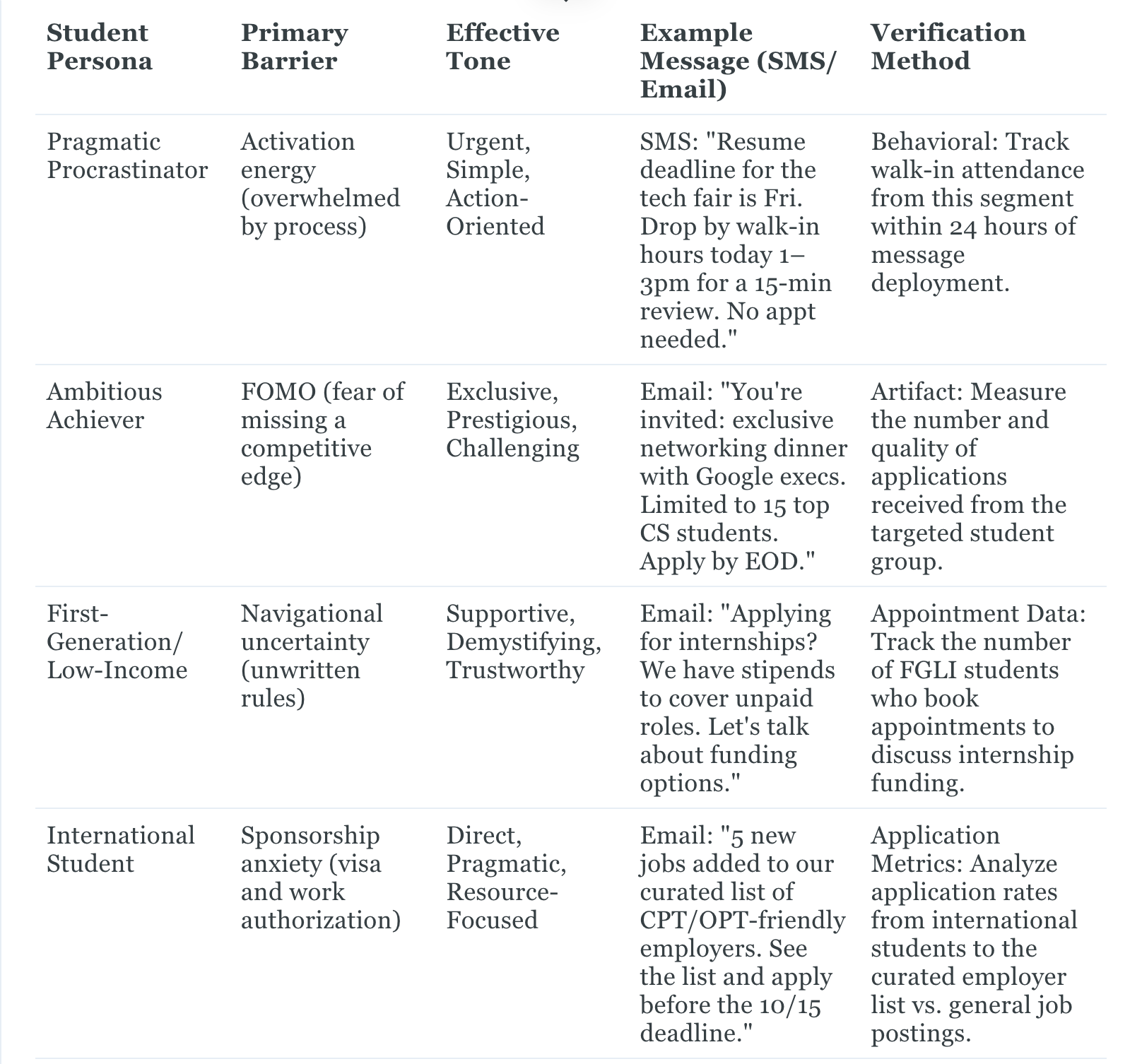 Verify personas by testing them against student behavior and advisor observations. Run A/B tests with persona-specific messages and track engagement lifts. For an FGLI persona anxious about finances, an email highlighting paid micro-internships should significantly outperform a generic “internship opportunities” message. A measurable lift in click-through and appointment bookings validates the persona's core motivation.