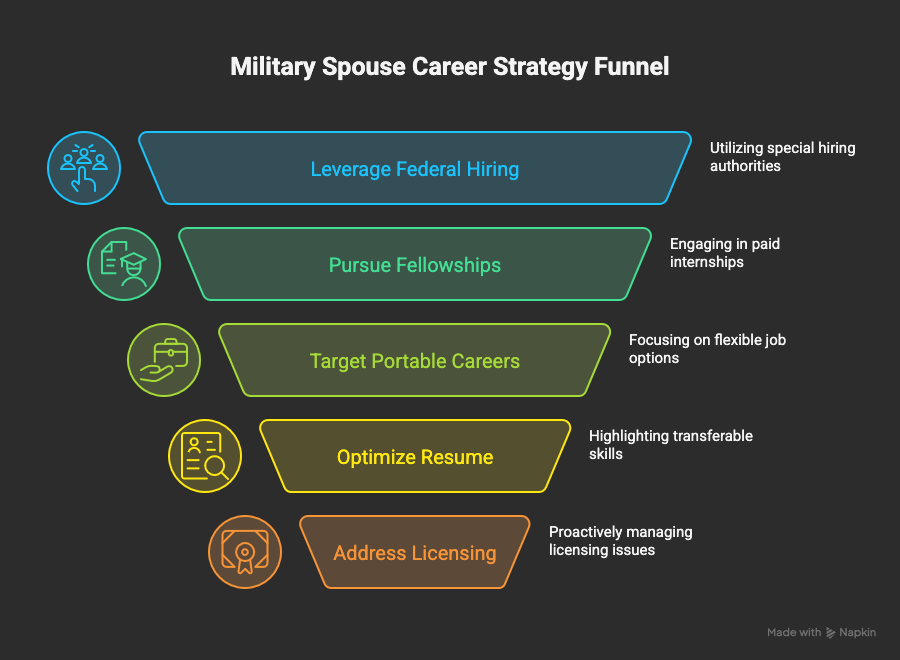 Military spouses face unique barriers—frequent relocations, licensing issues, and childcare gaps—but there are targeted strategies to overcome them. Leverage federal hiring authorities and preference programs, explore paid fellowships like Hiring Our Heroes, target portable career paths via MSEP and SECO, adapt your resume to address mobility, and proactively manage professional licensing. The right mix of awareness, positioning, and planning can turn mobility into a professional advantage.
