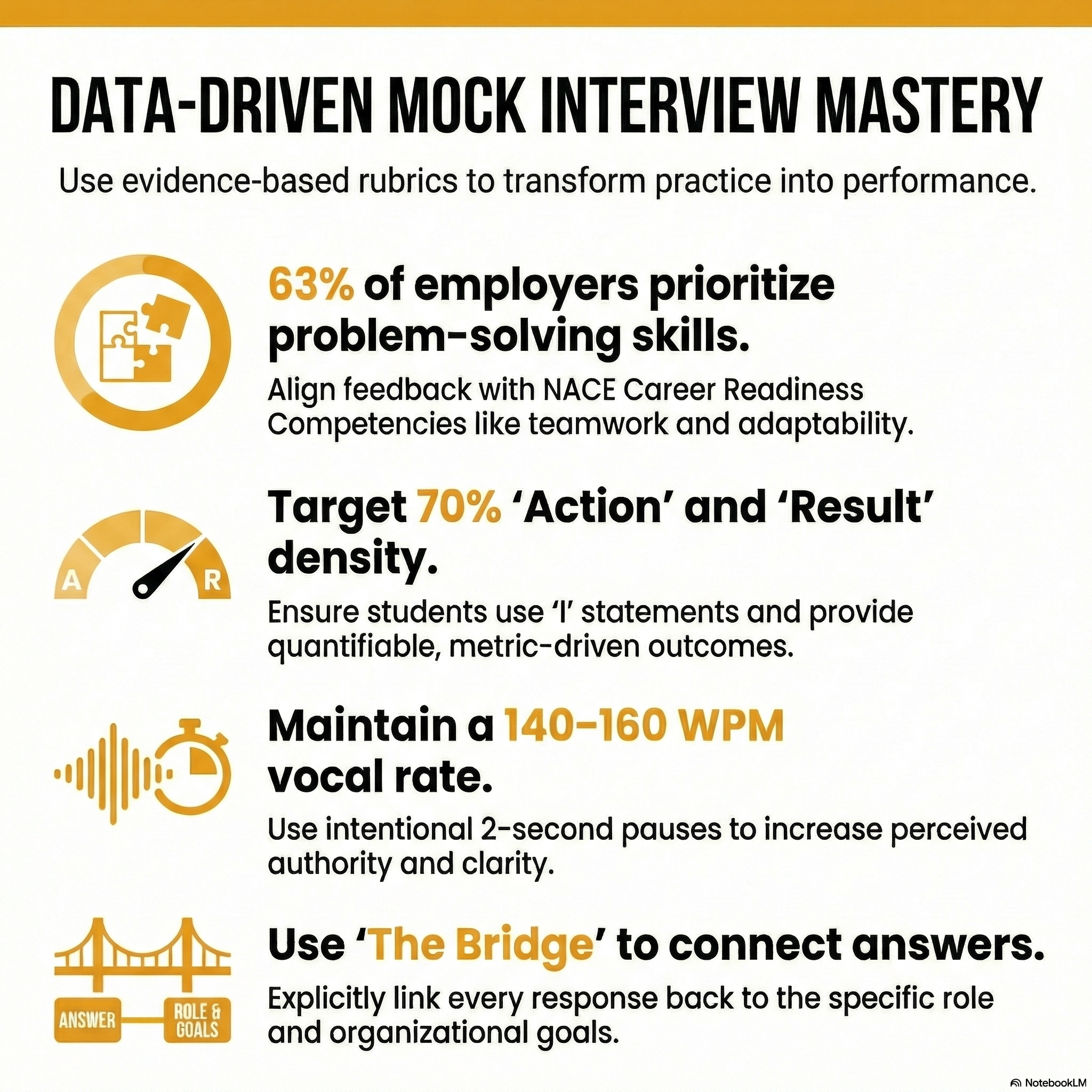 A robust mock interview rubric must align with the competencies employers actually assess, not generic interview advice. At a foundational level, this means scoring problem-solving, communication, and adaptability - core elements of the NACE Career Readiness Competencies - based on whether students can demonstrate them through specific, evidence-based examples rather than abstract claims.