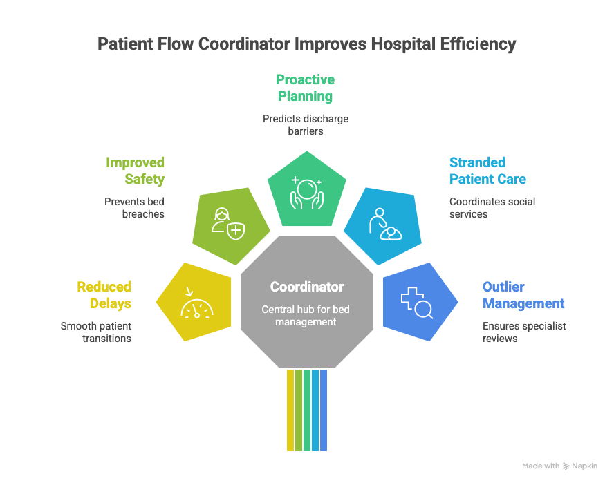 You also manage the placement of "outliers" (patients in non-specialty beds), ensuring they receive specialist reviews so their recovery isn't delayed by their location.