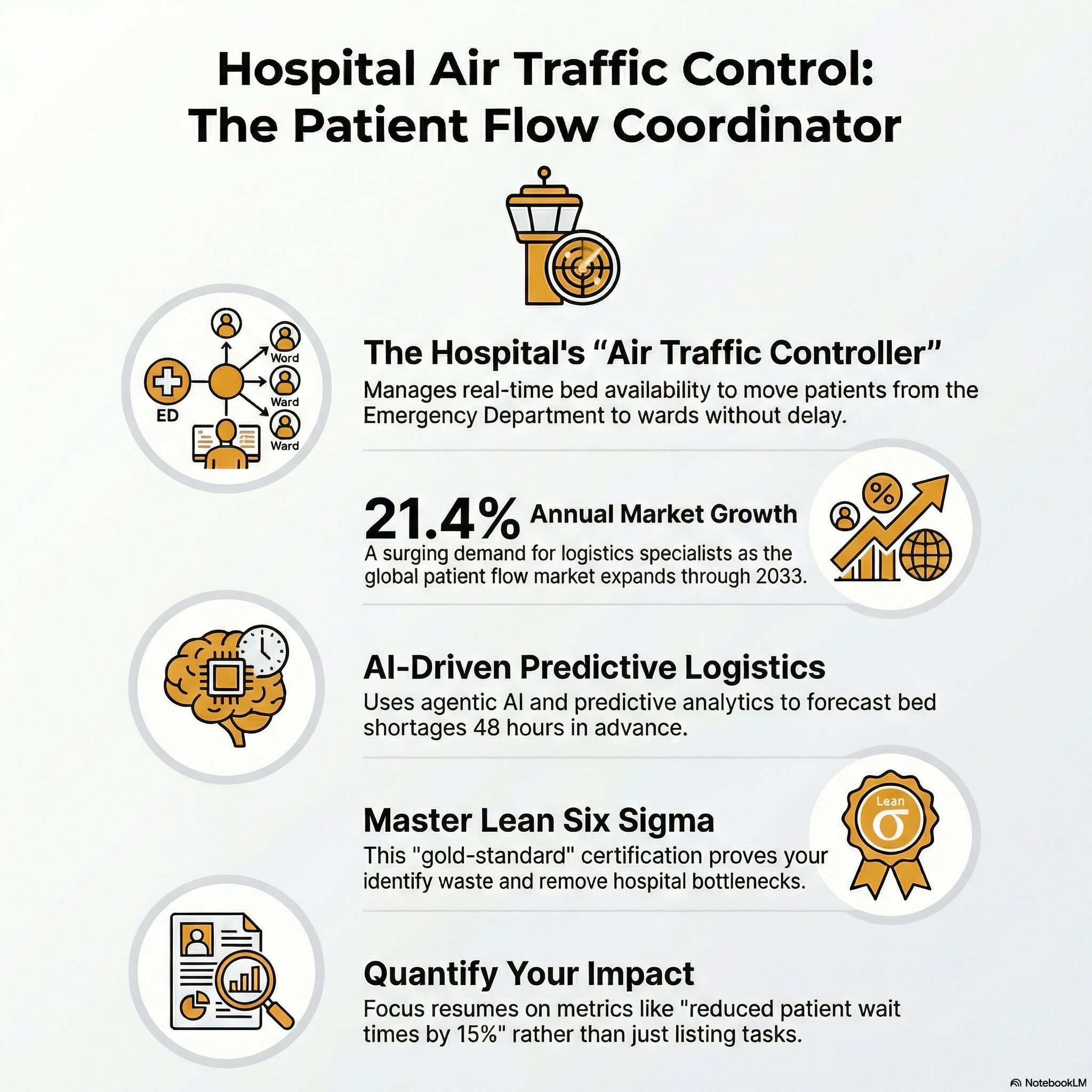 Patient Flow Coordinators manage hospital capacity, bed allocation, and patient movement to prevent delays and safety risks. The role combines logistics, data analysis, and real-time decision-making, with growing reliance on AI dashboards and predictive tools. Strong coordination skills, process efficiency training like Lean Six Sigma, and experience in high-pressure environments help candidates enter and advance in this field.