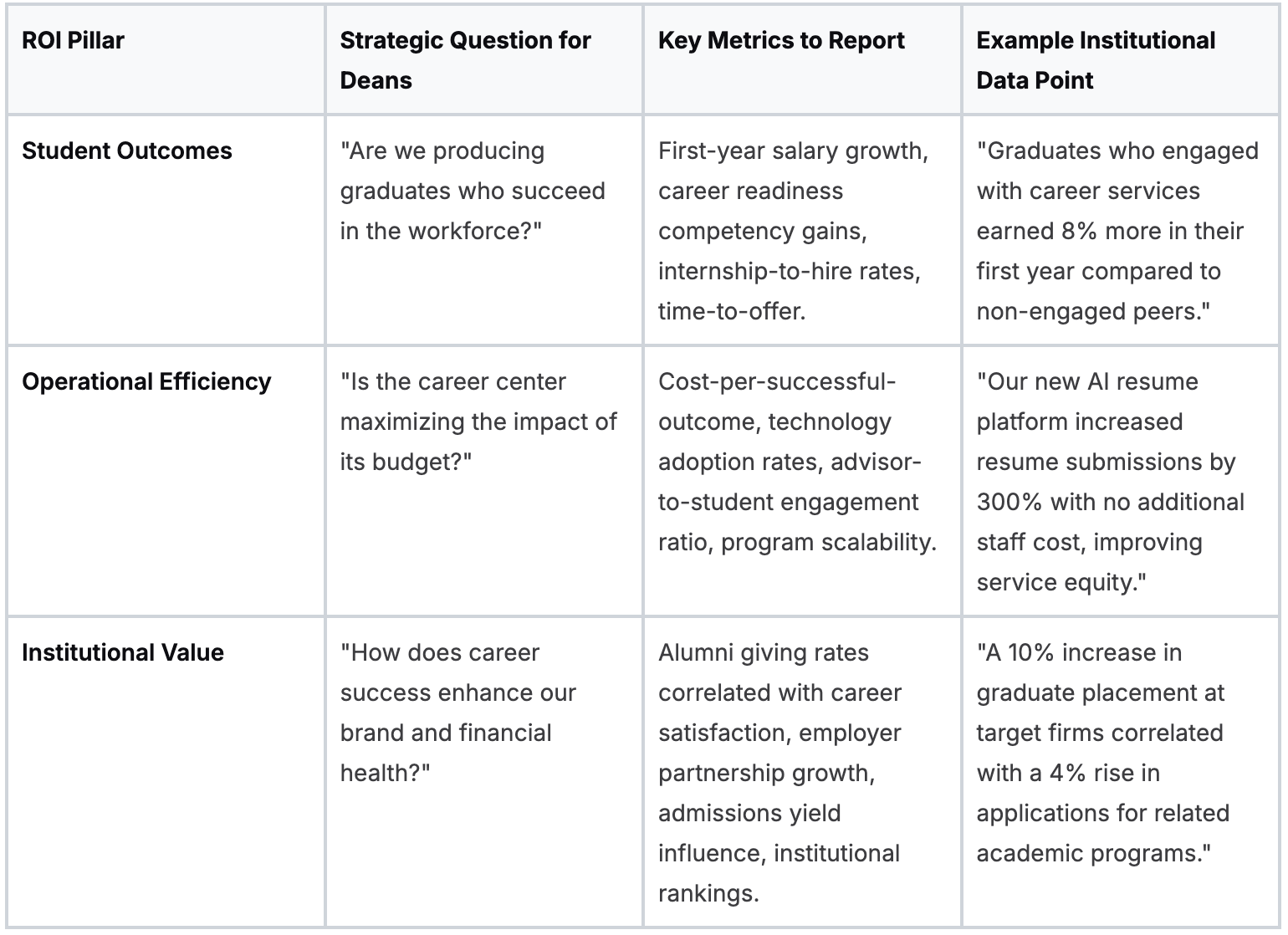 An effective ROI framework for deans and leadership must be built on three pillars that connect career services work to institutional strategy. Each pillar answers a different strategic question, building a comprehensive case for the career center's value beyond simple activity metrics.
