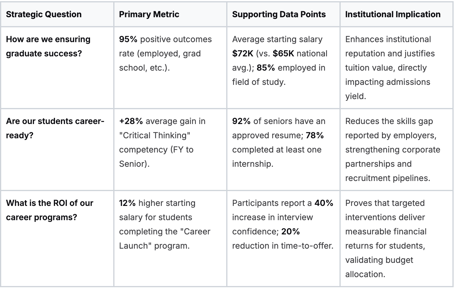 This dashboard acts as a strategic communication tool. It translates career center activity into the language of institutional impact by directly linking operational metrics to leadership priorities such as student success, retention, and institutional reputation.