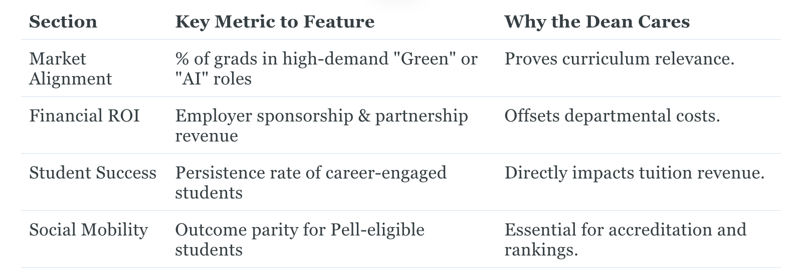 - Employer Yield: Track the "Applicant-to-Hire Ratio" for your top 10 campus recruiters to show deans that your talent pipeline is high-quality and efficient.