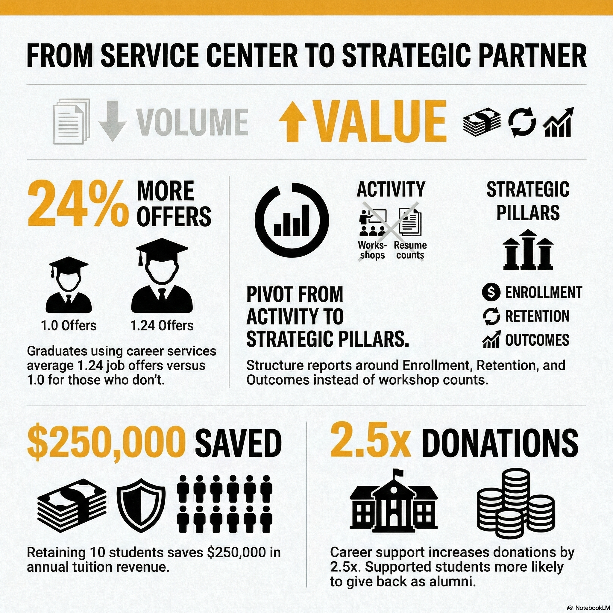 Leadership doesn't care about how many resumes you critiqued; they care about how those resumes translated into student retention, institutional ROI, and brand reputation.