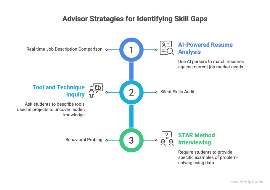Advisors can identify skill gaps by moving beyond keyword matching to "contextual auditing." Use AI-powered parsers to compare resumes against real-time job descriptions, and employ behavioral interviewing techniques that require students to prove competency through the STAR method. This shift reveals whether a student possesses the skill or just the terminology.