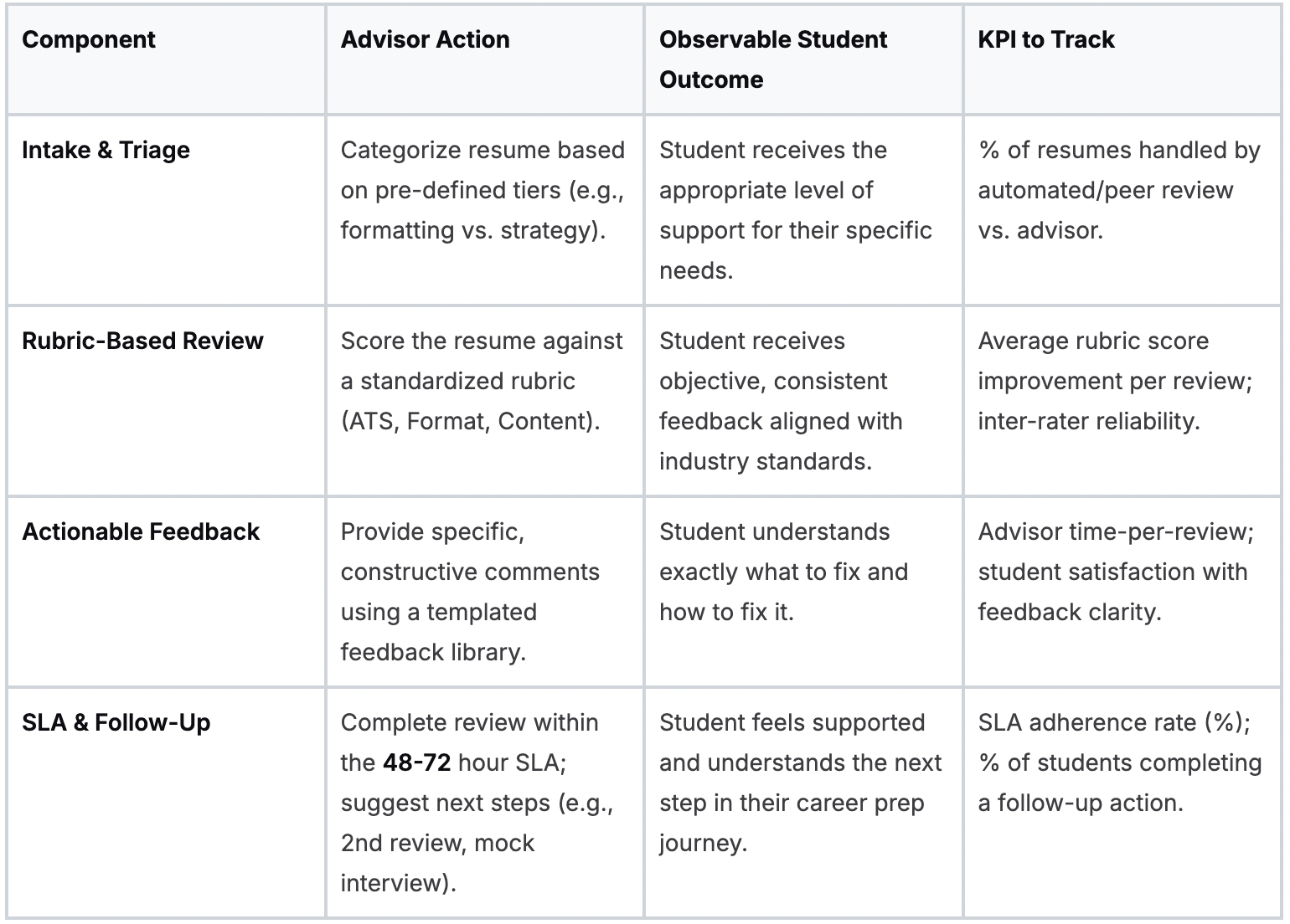 A robust resume review SOP moves your team from inconsistent critiques to a predictable, scalable operation. It requires four components: a defined review rubric, a triage workflow to segment requests, a library of templated feedback for common errors, and a clear service-level agreement (SLA). This system ensures every student receives high-quality feedback while optimizing advisor time.