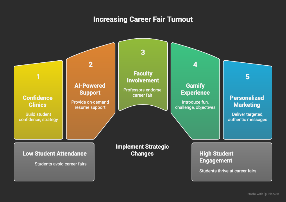 - Host "Confidence Clinics," Not Resume Reviews: Rebrand your prep sessions. Instead of just "Resume Reviews," host "Confidence Clinics" or "Career Fair Game Plan" workshops. Focus on building a strategy: how to approach a recruiter, what questions to ask, and how to follow up. Frame it around empowerment.