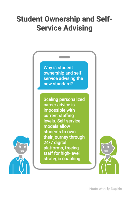 Scaling personalized career advice is impossible with current staffing levels. The median ratio is 1,381 students per professional staff member, according to the NACE 2024-25 Benchmarks Report. Self-service models allow students to own their journey through 24/7 digital platforms, freeing staff for high-level strategic coaching.
