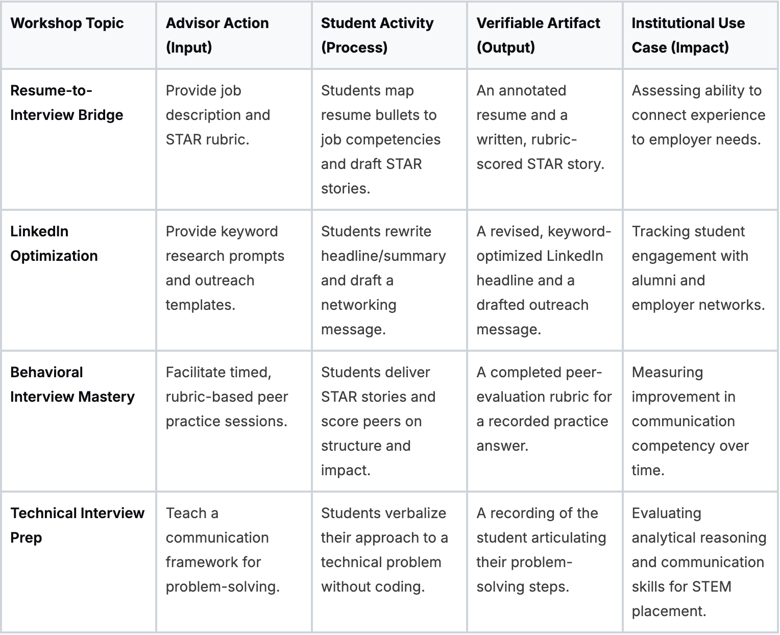 Advisors can redesign workshops to generate measurable artifacts by linking resumes to interview narratives, optimizing LinkedIn profiles for recruiter search, and running practice-based interview sessions with rubric scoring. When each session produces outputs like STAR stories, annotated resumes, outreach templates, and peer-evaluated interview responses, career centers can verify skill development and track readiness using tangible evidence instead of attendance.